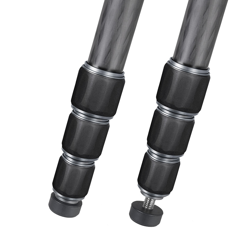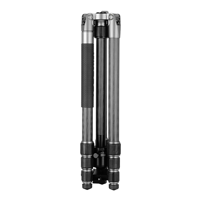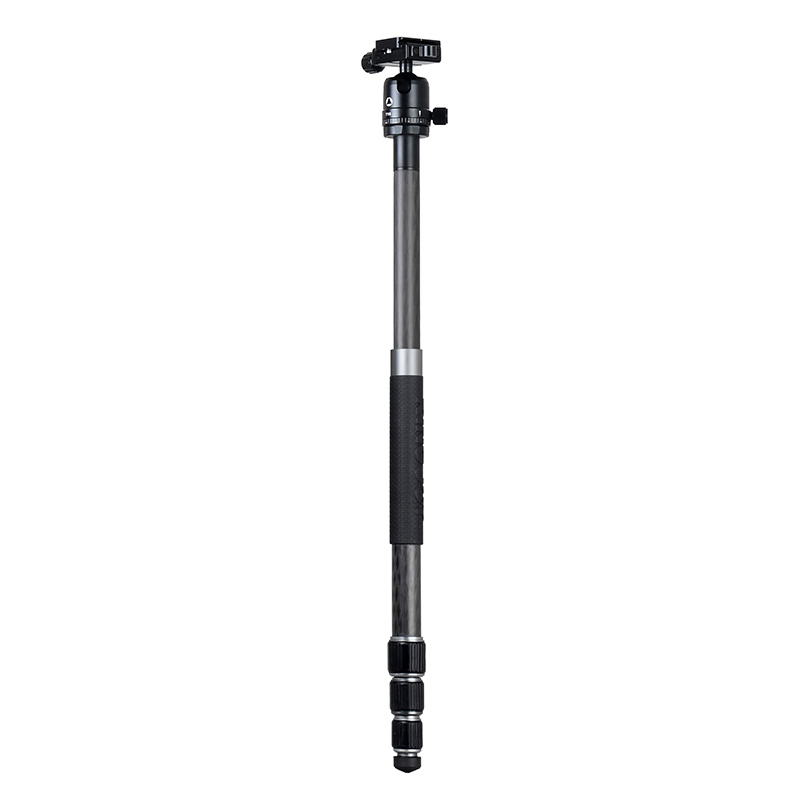 This Kingjoy A83 is a high-end professional quality lightweight travel tripod. Made from carbon fibre, it comes with a removable centre column, carry case, and compact ball head (optional). One of the three legs has a comfortable hand grip which makes carrying the tripod easier, especially in cold conditions. This leg also unscrews and attaches to the removable centre column to form a monopod or walking pole with comfortable grip. Each leg section is extended with a twist lock grip joint which is weather sealed to prevent dust and sand from entering the thread. It comes with removable rubber feet which can be unscrewed and replaced with metal spikes. There is a hook on the base of the centre column for attaching accessories. The tripod inverts on itself to from a compact travel mode which easily fits into most bags or suitcases for practical travel. Despite its lightweight and compact design, this tripod still provides outstanding sturdiness for even the heaviest of digital cameras.